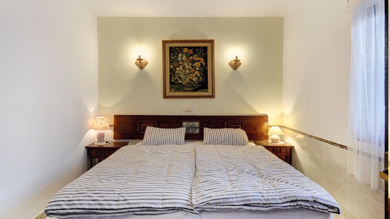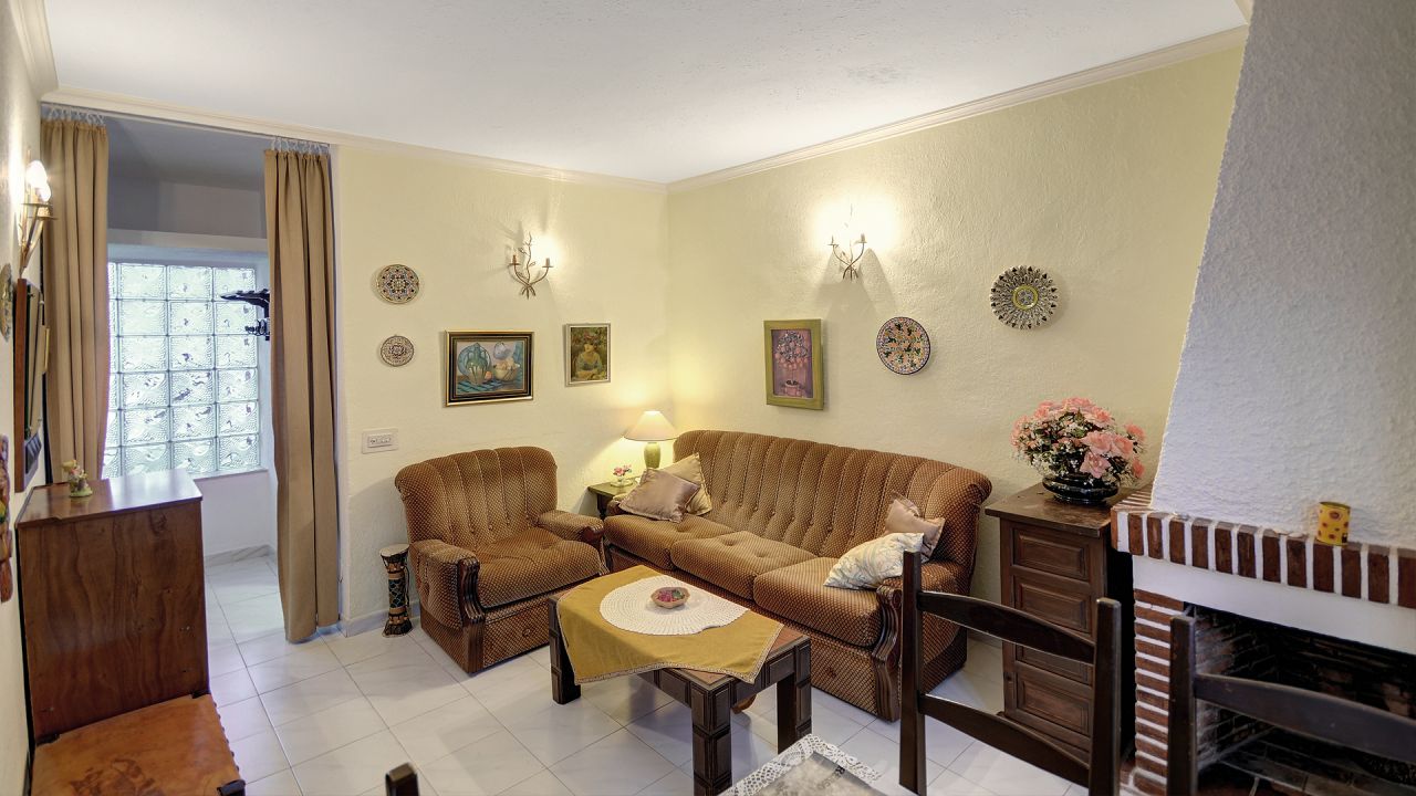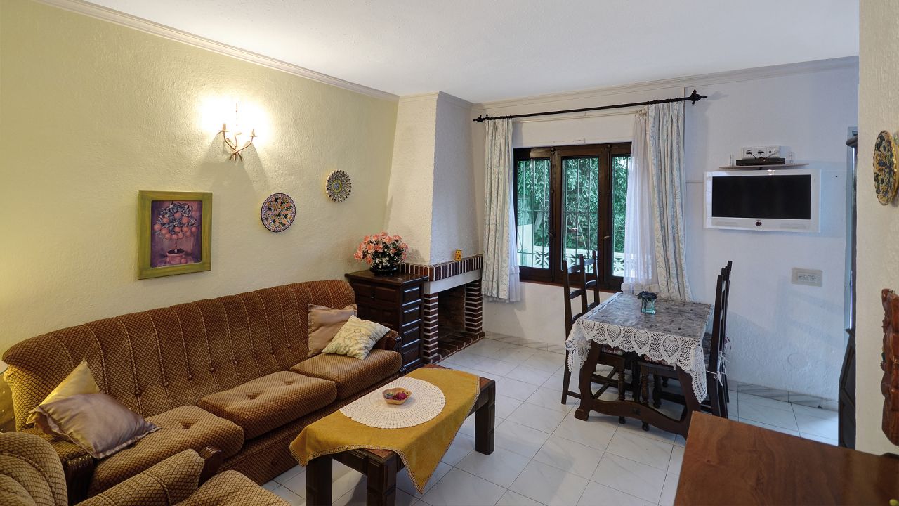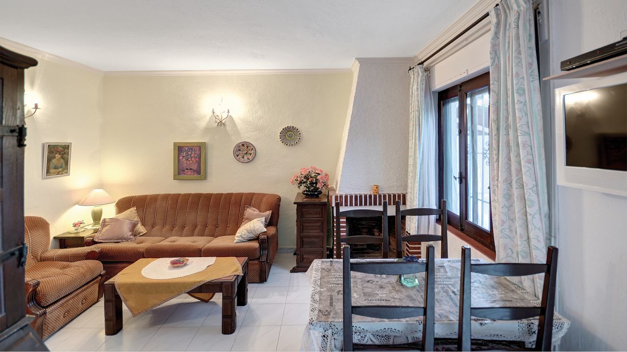 Über die nach Westen ausgerichtete Terrasse gelangt man ins Haus und direkt in den hellen Wohn-Essbereich mit offenem Kamin. Links anschließend befindet sich die Küche und am Ende des Wohnbereichs führt ein kleiner Flur zum Schlafzimmer, das mit Einbauschränken ausgestattet ist, und zum separaten Badezimmer.