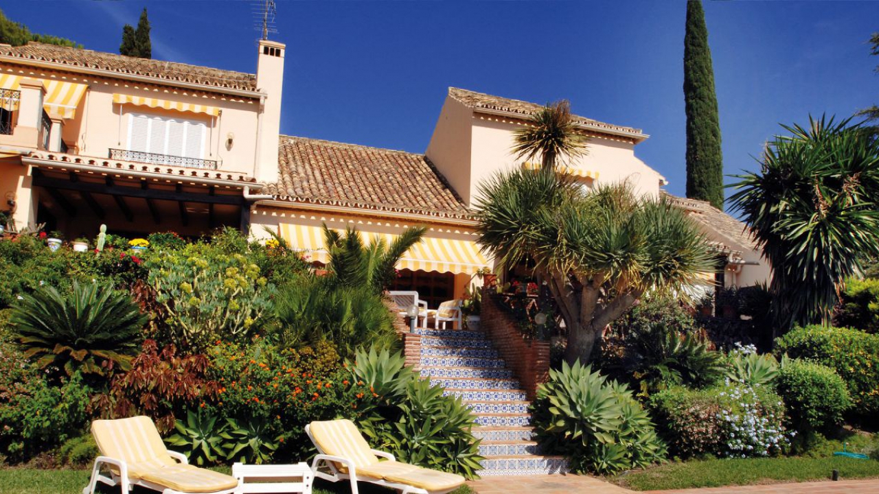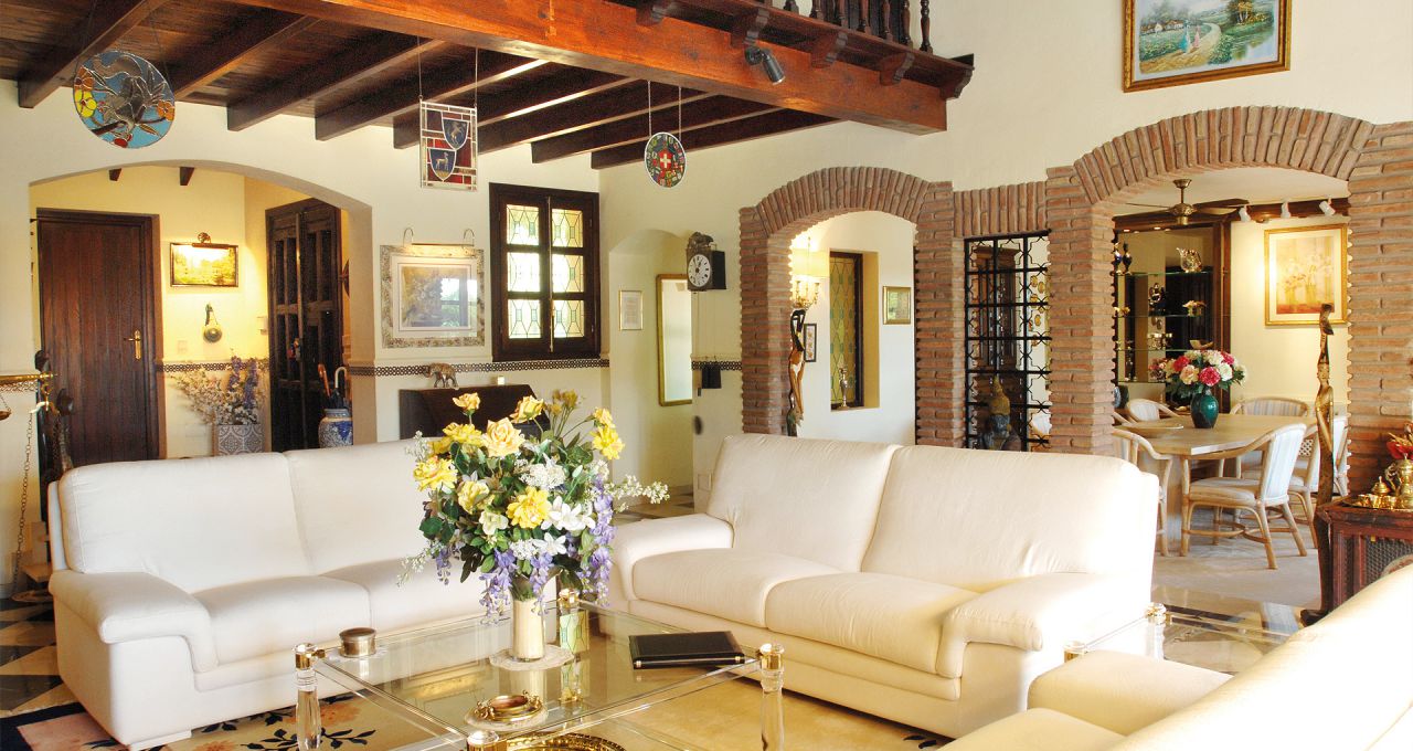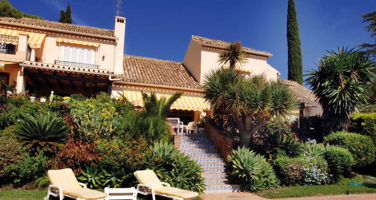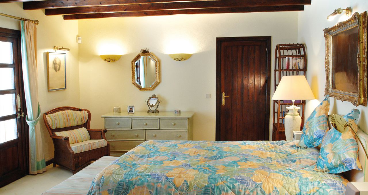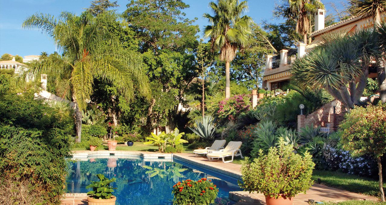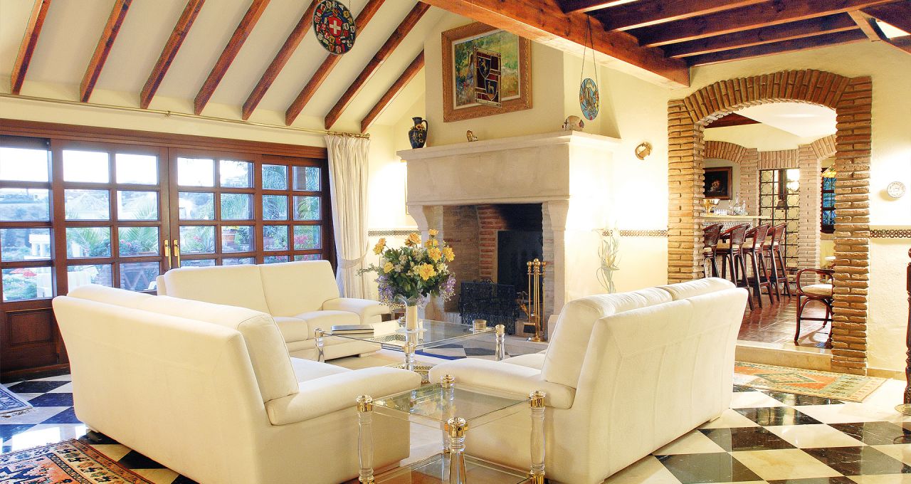 Durch den Eingangsbereich gelangt man in den geräumigen, Licht durchfluteten Wohnbereich mit Kamin und großen Panorama-Schiebetüren, welche auf die weitläufige Terrasse und weiter zum Pool im üppigen, mit Palmen und exotischen Gewächsen bewachsenen, Garten führen. Die Terrasse erstreckt sich über die ganze südliche Seite des Hauses, ist mit einer Pergola halb überdacht und bietet einen herrlichen Ausblick auf den großen Swimmingpool, den Garten und das Mittelmeer. Neben dem Pool befindet ein kleines Nebengebäude mit einer Außenküche und Grillplatz.