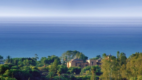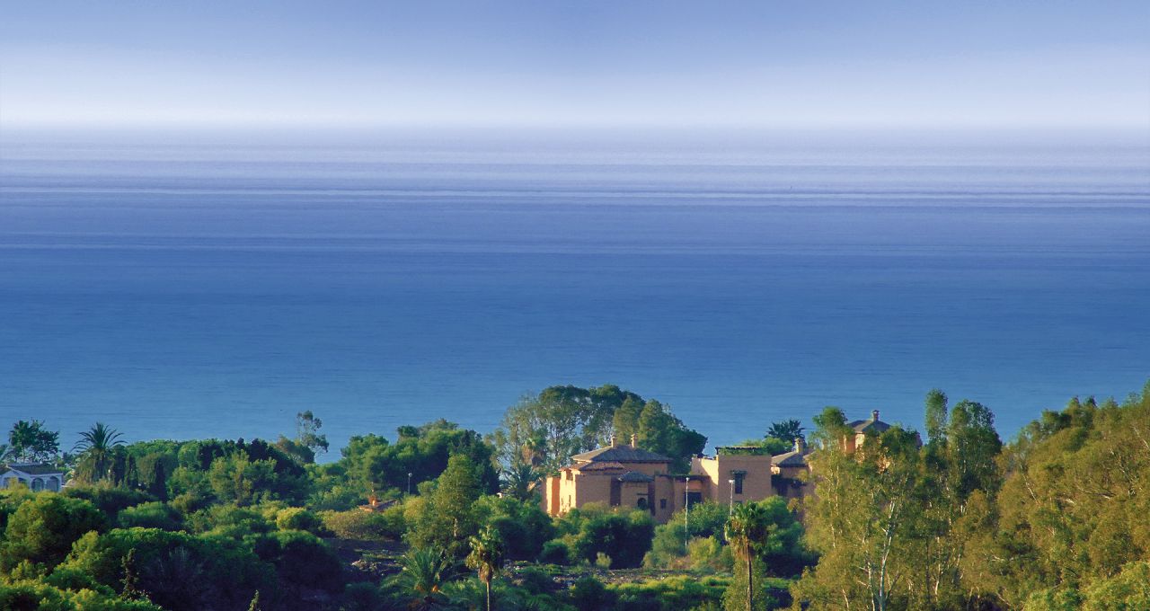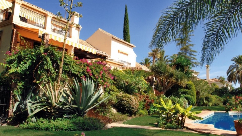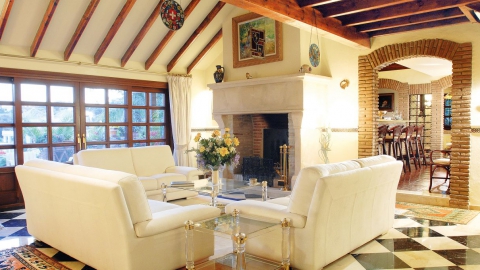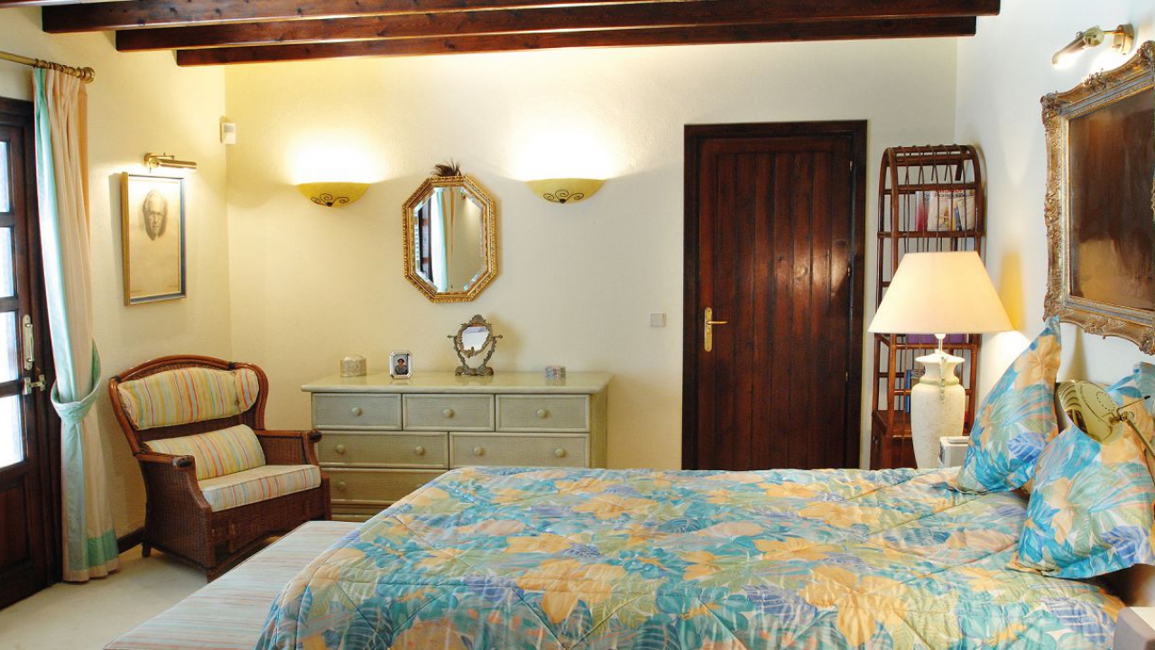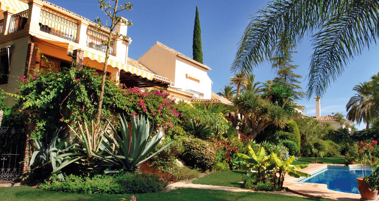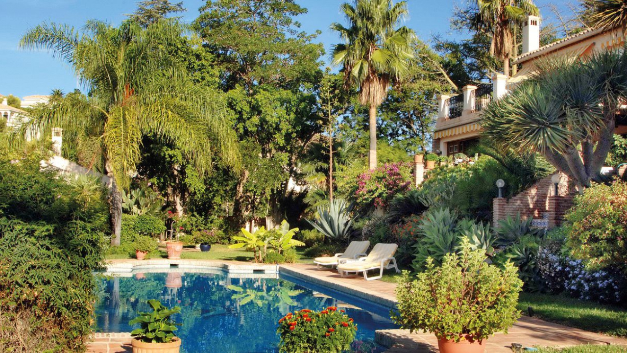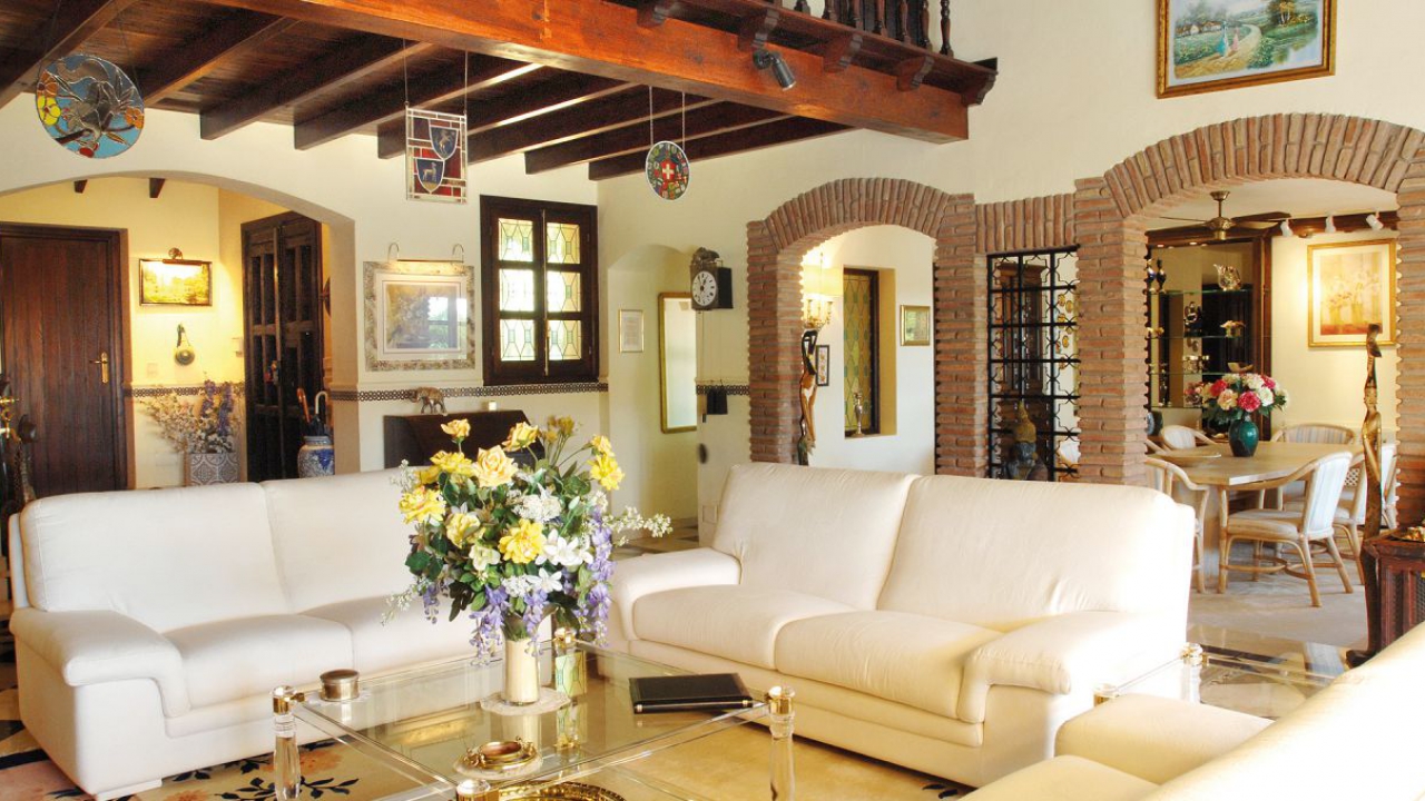 Durch den Eingangsbereich gelangt man in den geräumigen, Licht durchfluteten Wohnbereich mit Kamin und großen Panorama-Schiebetüren, welche auf die weitläufige Terrasse und weiter zum Pool im üppigen, mit Palmen und exotischen Gewächsen bewachsenen, Garten führen. Die Terrasse erstreckt sich über die ganze südliche Seite des Hauses, ist mit einer Pergola halb überdacht und bietet einen herrlichen Ausblick auf den großen Swimmingpool, den Garten und das Mittelmeer. Neben dem Pool befindet ein kleines Nebengebäude mit einer Außenküche und Grillplatz.