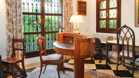 Vom Eingangsbereich führt eine Treppe über eine Galerie mit Lese-Ecke ins obere Stockwerk zu den beiden Hauptschlafzimmern mit jeweils eigenem Ankleidezimmer, geräumigem En-suite Bad und privater Terrasse.